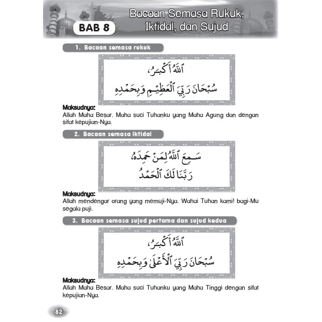 Walau bagaimanapun tulisan rumi tidak dapat mengeja sebutan tajwid dan makhraj arab dengan tepat. Subḥāna rabbiyal aẓīmi wa biḥamdih. Saya pernah shalat jumat yang khatib dan imamnya adalah omar syihab setelah rukuk dan setelah bacaan sami allaahu liman hamidah tanpa tuma ninah imam langsung allahu akbar sujud yang berarti nggak pakai doa i tidal. Sujud bisa menjadi momen istimewa bagi manusia.