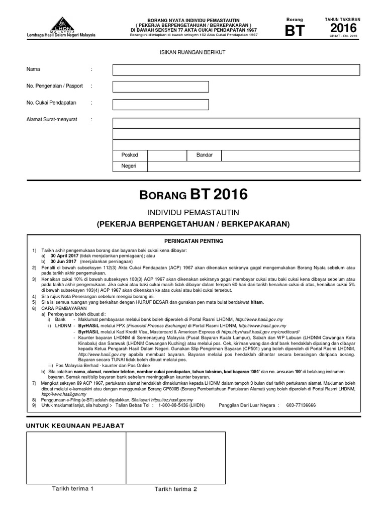 Borang be 2016 lhdn. 3 9 2016 3 45 29 pm. Lembaga hasil dalam negeri lhdn melalui lampiran yang boleh dirujuk di lhdn yang memaklumkan bahawa pembayar cukai boleh mengemukakan borang nyata cukai pendapatan bncp tahun taksiran 2019 mereka melalui e filing bagi borang e be b bt p m mt dan tf mulai 1 mac 2020 ini. Pembayar cukai dinasihatkan untuk menggunakan pengesahan penerimaan borang nyata cukai pendapatan sebagai pengesahan status seseorang yang dikenakan cukai di malaysia. Bahagian b borang b isteri perlu diisi sehingga ruang b16 sahaja.