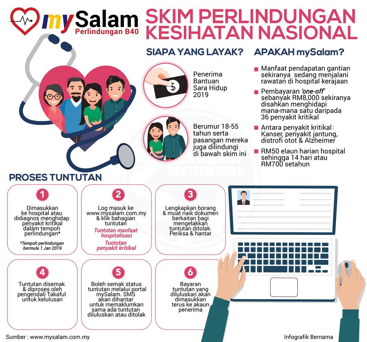 Skim my salam insuran malaysia adalah inisiatif kerajaan yang bertujuan menyediakan perlindungan kesihatan takaful percuma kepada 3 8 juta individu b40 yang juga penerima bantuan sara hidup bsh 2019 berumur 18 hingga 55 tahun serta pasangan mereka. Selain daripada bantuan sara hidup bsh bujang yang sedang rancak diberikan kepada kalangan golongan b40 dan tidak lupa juga golongan m40 dan penerima layak yang lain satu lagi inisiatif bantuan rakyat telah. Ikut proses daftar my sejahtera seperti di atas.