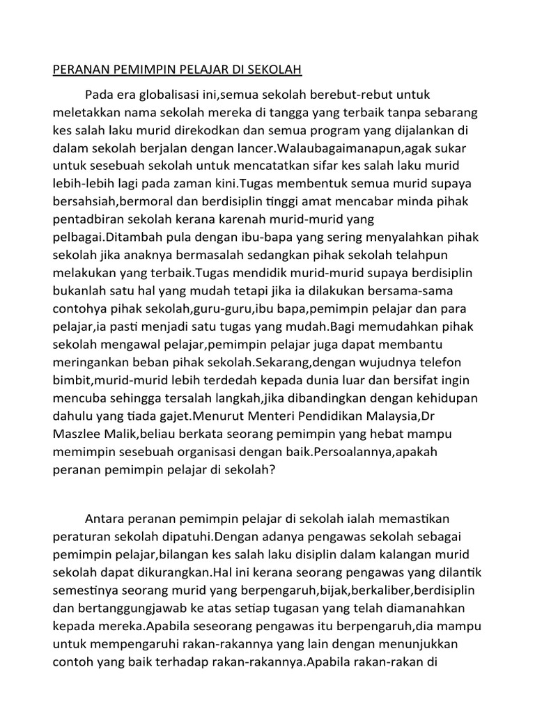 Contoh karangan peranan pemimpin pelajar di sekolah. Sebagai pemimpin pelajar di sekolah adakah anda telah berusaha. Di dalam laporan yang disediakan saya telah mengkaji semula peranan ketua kelas dan badan pengawas sekolah dan menerangkan peranan badan pengawas dan ketua kelas secara terperinci. Antara contoh yang boleh dikemukakan dalam hal ini ialah pemimpin pelajar memastikan pelajar datang ke sekolah pada masa yang ditetapkan tidak merokok di sekolah dan mengelakkan kes buli di sekolah. Kesedaran tentang peranan peranan penting yang perlu digemblengkan oleh pihak sekolah dan guru guru menyebabkan peranan pemimpin sekolah amat ditagih kerana tanpa kolaborasi mereka objektif utama pihak sekolah untuk melahirkan pelajar yang cemerlang gemilang dan terbilang tidak akan kesampaian.