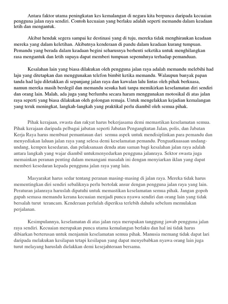 Pelajar boleh merujuk isi dan contoh huraian di bawah sebagai panduan. Karangan spm punca punca kemalangan jalan raya di negara kita. Bak kata pepatah melayu kalau tidak ada angin masakan pokok bergoyang kerana setiap perkara yang berlaku pasti ada sebabnya. Bimbingan daripada guru masing masing masih diperlukan agar penulisan karangan pelajar menjawab kehendak soalan dan layak mendapat markah yang cemerlang.