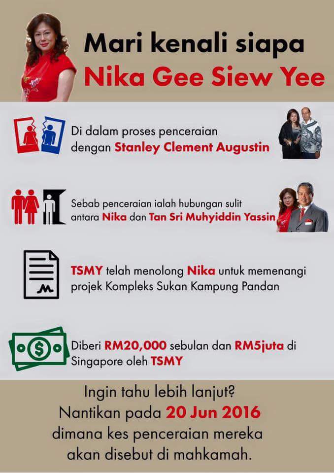 Lawyer datuk stanley clement augustin is officially divorced from his wife datuk nika gee siew yee today. Pertama sekali jika anda tidak mengikuti kisah berkenaan kes perceraian seorang wanita bernama nika gee siew yee yang telah membuat pengakuan kepada suaminya stanley clement augustin bahawa dia mengadakan hubungan sulit sekian lama dengan muhyiddin yassin maka anda boleh membaca cerita tersebut pada link di bawah. Muhyiddin must sue to prove his. Businesswoman datuk nika gee siew yee was charged in a sessions court in kuala lumpur on friday with accessing a computer without authorisation two years ago.