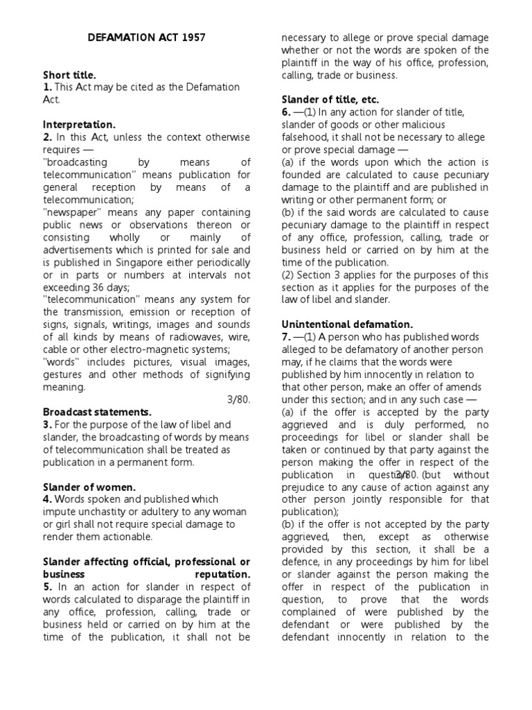 Def ama tion act 1957 incorporating all amendments up to 1 january 2006 published by the commissioner of law revision malaysia under the authority of the revision of laws act 1968 in collaboration with percetakan nasional malaysia bhd 2006 d e f a m a t io n a c t 1957 f irst en acted é. Peninsular malaysia 1 july 1957. The defamation act only applies to civil claims.