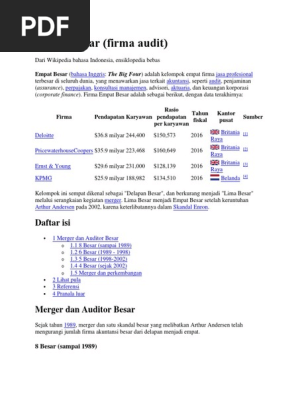 Firma perakaunan terbesar di dunia. Di bawah jenama ey yang merupakan singkatan nama syarikat itu telah beroperasi sejak tahun 2013. Perakaunan vault 50 menduduki ranking pwc sebagai firma perakaunan paling berprestij di dunia selama tujuh tahun berturut turut serta firma teratas untuk bekerja di amerika utara selama tiga tahun berturut turut. Sejarah 4 firma perakaunan besar boleh dilihat semula dari latar belakang firma di eropah yang telah mengalami penggabungan sehingga sekarang. Kejatuhan empayar enron boleh disifatkan sebagai kebankrapan terbesar dalam sejarah amerika dan menunjukkan kelemahan sistem audit yang digunakan pada masa itu.