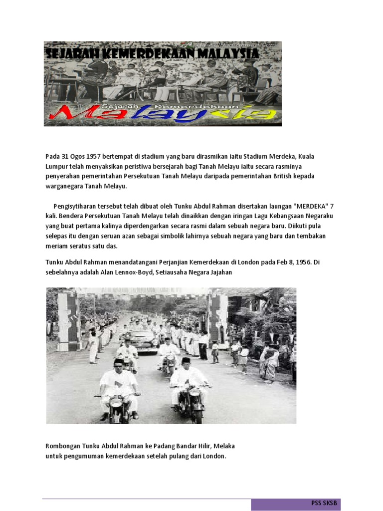 Liku dan jejak perjuangan patriot dan nasionalis menentang british abdullah zakaria ghazali pendahuluan pada tahun ini 31 ogos 2012 genaplah 55 persekutuan tanah melay kini dikenali sebagai malaysia mencapai kemerdekaan. Dalam masa beberapa hari lagi persekutuan tanah melayu yang kini dikenali sebagai malaysia akan menyambut hari kemerdekaan yang ke 56 tahun. Tokoh tokoh perjuangan di tanah melayu. 31 ogos 1957 pengisytiharan kemerdekaan persekutuan tanah melayu yang pertama telah dibuat oleh tunku abdul rahman putra perdana menteri persekutuan tanah melayu tepat pada pukul 12 00 tengah malam di padang kelab selangor kuala lumpur.