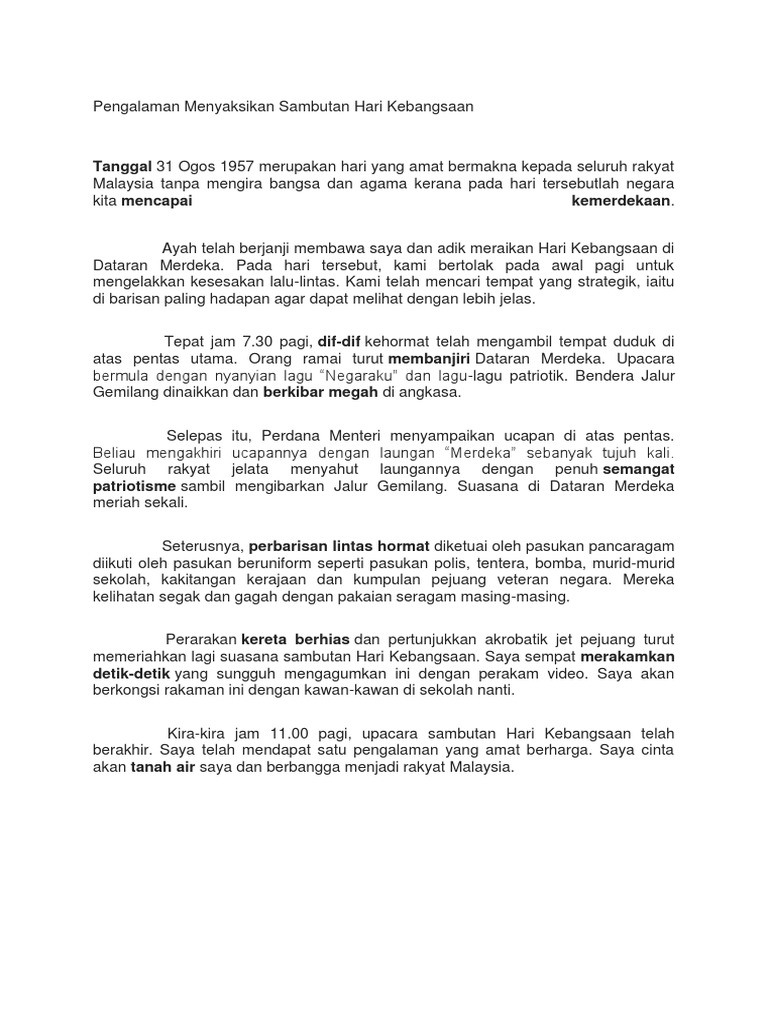 Karangan pengalaman sambutan hari kemerdekaan di sekolah. Rani pun bercerita kepada guru dan semua teman temannya bahwa ia selalu dibiasakan mengerjakan tugas sekolah saat siang hari. Karangan pengalaman sambut kemerdekaan peringkat sekolah source sumber. Pada 31 ogos negara kita akan menyambut ulang tahun hari kemerdekaan setiap tahun. Sekolah anda telah mengadakan aktiviti sepanjang bulan kemerdekaan.