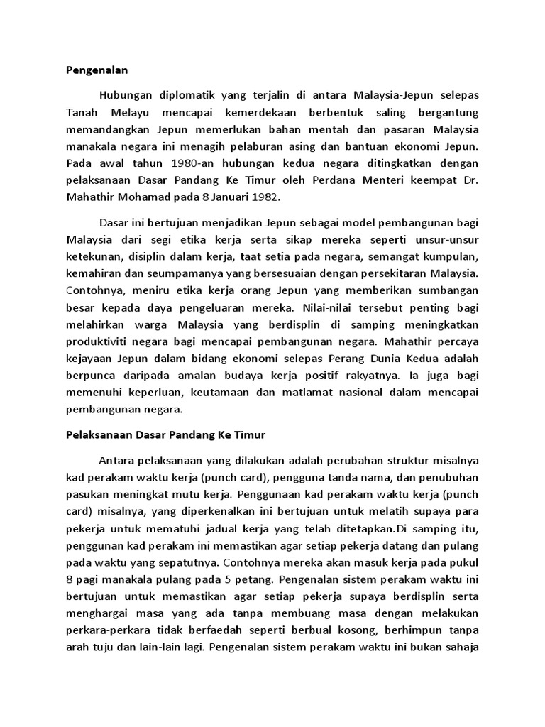 Dasar pandang ke timur latarbelakang dasar pandang ke timur ini telah diumumkan oleh y a b. Sebaliknya kerajaan akan terus memperluaskan lagi perdagangannya dengan mengadakan hubungan dengan rakan rakan bukan tradisional di samping terus mengekalkan dan memajukan hubungan perdagangan yang setia selaras dengan kepentingan negara. Latar belakang dasar pandang ke timur ini telah diumumkan oleh y a b. Beliau berpendapat monopoli britain mesti dipecahkan supaya ekonomi malaysia tidak berada di bawah pengaruh barat.