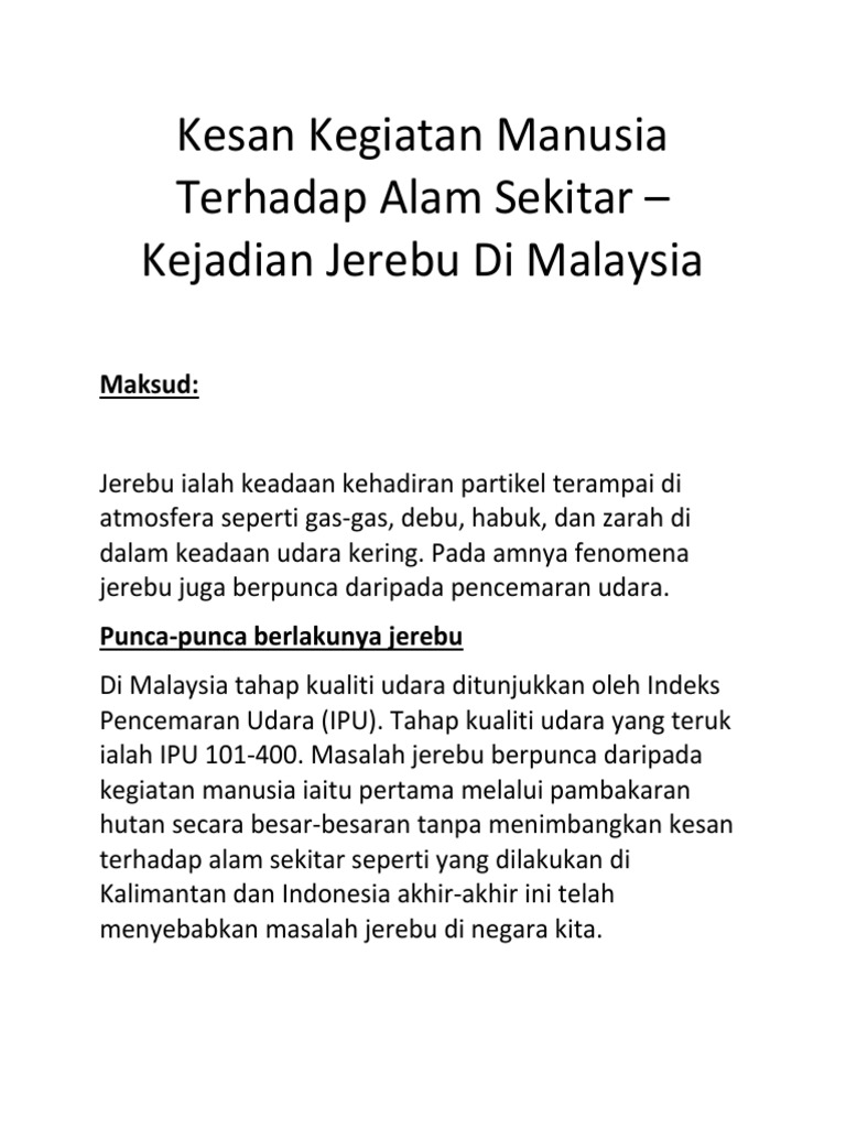 Masalah jerebu berpunca daripada kegiatan manusia iaitu pertama melalui pambakaran hutan secara besar besaran tanpa menimbangkan kesan terhadap alam sekitar seperti yang dilakukan di kalimantan dan indonesia akhir akhir ini telah menyebabkan masalah jerebu di negara. Bincangkan kesan kesan nagatif maslah jerebu kepada masy. Kesan jerebu terhadap manusia walaupun kita nampak macam remeh seperti bersin mata pedih jika dibiarkan pasti melarat menjadi lebih serius.