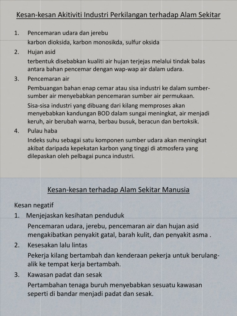 Kesan jerebu terhadap alam sekitar. Kesan jangka pendek yang ketara ialah implikasi kesihatan jerebu mengandungi gas gas yang merbahaya seperti nitrogen dioksida sulfur dioksida dan karbon dioksida gas gas ini dan zarah terampai akan memasuki badan kita melalui pernafasan situasi ini akan menyebabkan mangsa diserang penyakit lelah asma sakit tekak selesema pedih mata bronkitis dan sebagainya dalam kes yang lebih teruk bendasing. Cara mengatasi kesan pencemaran udara pelbagai usaha untuk menangani isu isu alam sekitar telah dilakukan sama ada oleh kerajaan pihak swasta dan masyarakat sendiri melalui cara perundangan dan bukan perundangan namun hasilnya tetap tidak memuaskan. Di malaysia tahap kualiti udara ditunjukkan oleh indeks pencemaran udara ipu. Karangan punca jerebu kesan jerebu dan mengatasi jerebu.