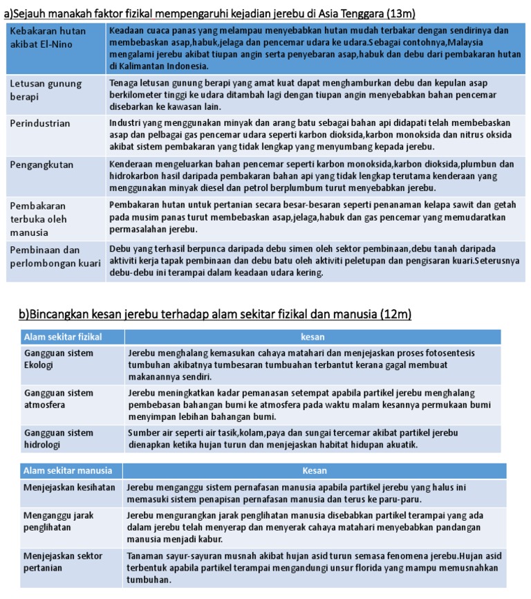 Bahan yang mencemarkan udara pepejal cecairgas 5. Tahap kualiti udara yang teruk ialah ipu 101 400. Itu kesan jerebu kepada mereka yang tidak mempunyai penyakit penafasan seperti asma bayangkan jika pesakit asma terdedah pada jerebu dan kesannya menjadi 2 kali ganda bahaya daripada mereka yang normal. Pertama melalui pambakaran hutan secara besar besaran tanpa menimbangkan kesan terhadap alam sekitar seperti yang dilakukan di kalimantan dan sumatera indonesia akhir akhir ini telah menyebabkan masalah jerebu di negara kita.