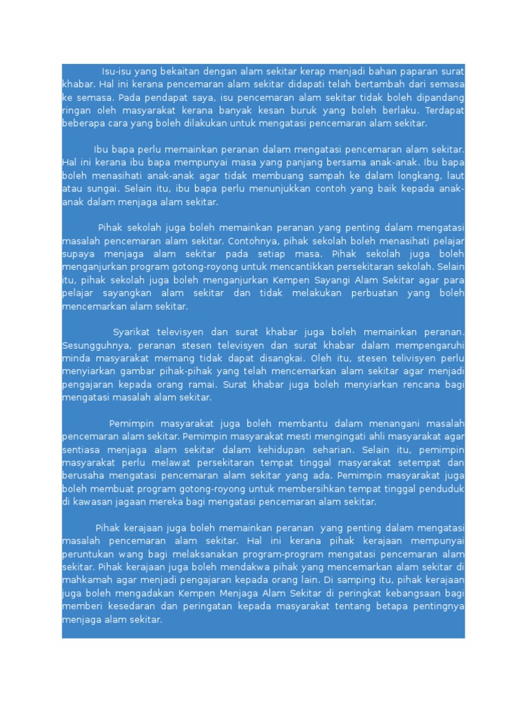 Keadaan ini disebabkan oleh pelbagai kelemahan dan kekangan dalam melaksanakan langkah langkah tersebut. Di malaysia kita amat beruntung kerana dikurniakan banyak sungai untuk kegunaan masyarakat tempatan biarpun corak. Isi 2 selain itu langkah yang boleh dilakukan bagi menangani masalah pembuangan sampah adalah dengan mengamalkan kitar semula. Hal ini demikian kerana bahan kimia akan mendatangkan pencemaran kepada alam sekitar selain akan mendatangkan impak dalam jangka masa yang panjang kepada alam sekitar.
