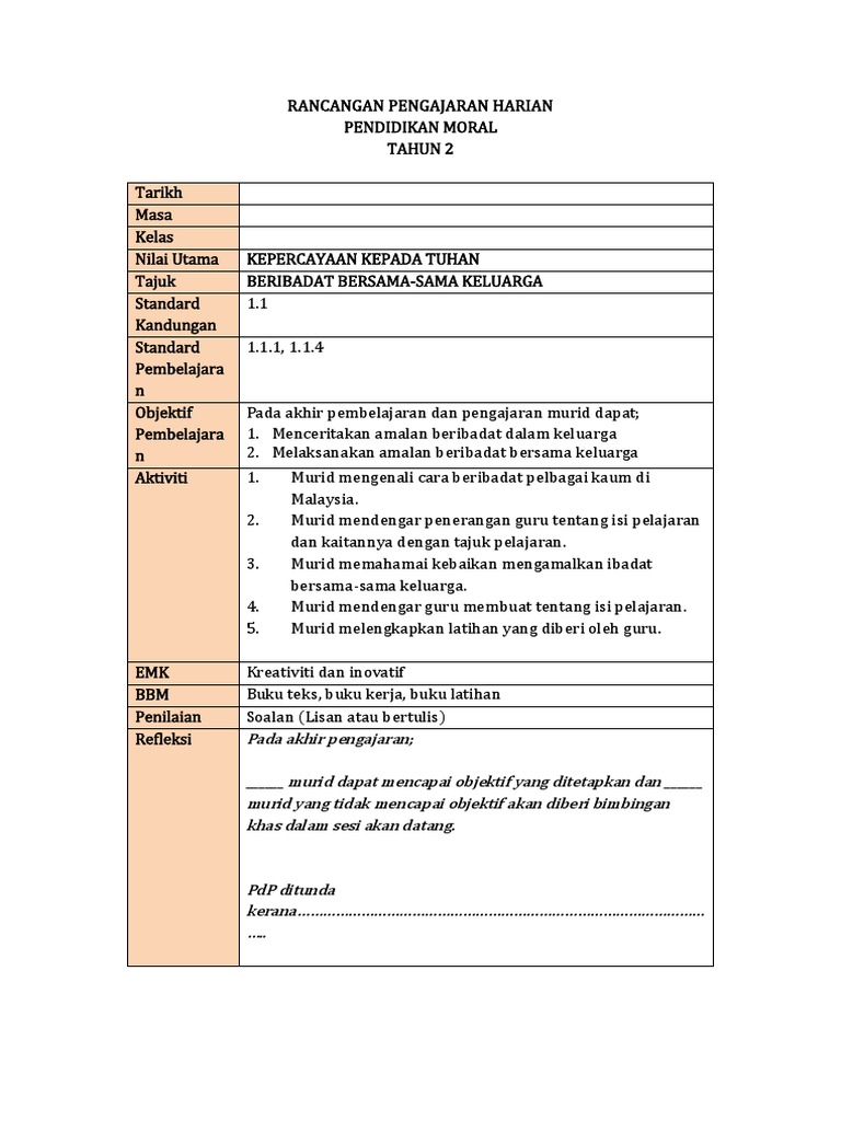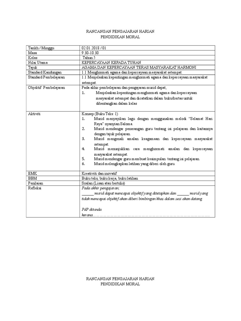 Rph pendidikan moral tahun 5 adalah rancangan pengajaran harian yang perlu disediakan lebih awal oleh guru sebelum menjalankan sesi pegajaran dan pembelajaran rancangan pengajaran harian ini dibina sebagai panduan para guru untuk mengajar dengan lebih sistematik dan efektif serta mampu untuk mencapai apa yang diobjektifkan dalam sesi pengajaran dan pembelajaran kelak. Klik di sini kepercayaan kepada tuhan. Pendidikan moral tahun 5. Semoga bermanfaat kepada guru.