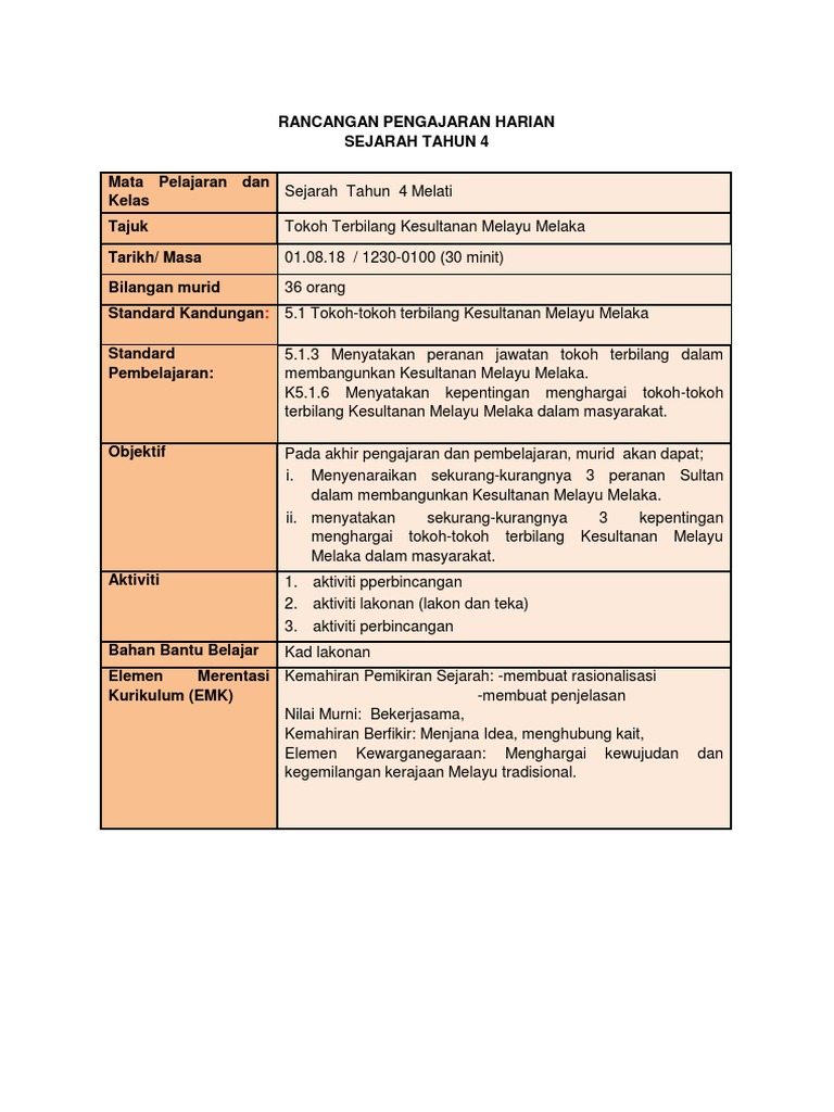 Rancangan pengajaran harian sejarah mata pelajaran dan kelas sejarah tahun 4 jujur tema tajuk tokoh tokoh terbilang kesultanan melayu melaka tarikh 4 september 2017 selasa masa 12 30 1 30 pm 60 minit bilangan murid standard kandungan 5 1 mengetahui dan memahami tokoh terbilang kesultanan melayu melaka standard pembelajaran 5 1 3 menyatakan peranan. Guru menimbulkan perasaan pencapaian murid dan memberikan peneguhan positif. Di antara tokoh tokoh ini terdiri daripada parameswara bendahara tun perak dan laksamana hang tuah yang telah memainkan peranan penting dalam membina keagungan kesultanan melayu melaka. Video tokoh terbilang bahagian 1 video tokoh terbilang bahagian 2 5 1 1 maksud tokoh terbilang tokoh yang mempunyai keistimewaan dan memberikan sumbangan kepada kegemilangan sesebuah negara dan bangsa.