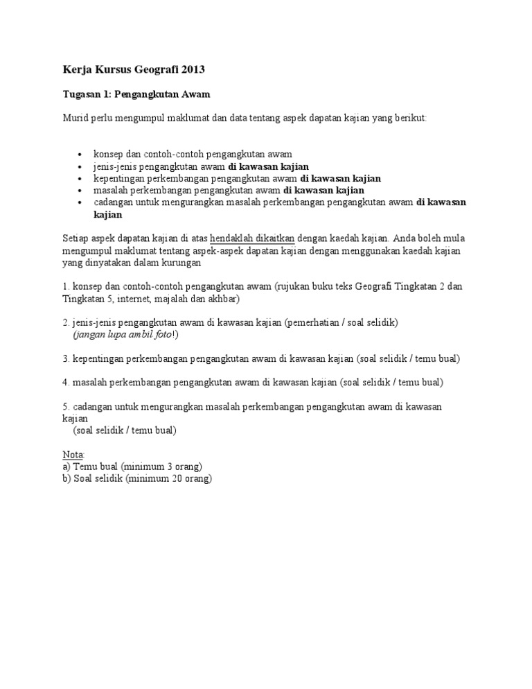 Masalah perkembangan pengangkutan awam di kawasan kajian. Tambahan lagi kajang kini sudah berkembang pesat. Dapatan kajian merangkumi konsep jenis pengangkutan awam kepentingan masalah dan cadangan mengurangkan masalah perkembangan pengangkutan awam di kawasan kajian calon. Hasil dapatan kajian hdp adalah bahagian yang sangat penting dalam kerja kursus geografi. Rumusan di kawasan kajian ini iaitu kajang banyak berlaku kesan kesan akibat perkembangan pengangkutan terhadap alam sekitar.