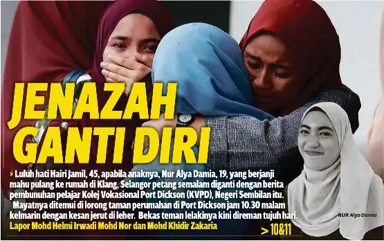 Nur alya damia hairi. Timbalan ketua polis daerah port dickson superintendan mohd faisal mohd noor berkata suspek yang juga berusia 19 tahun dikatakan menjemput mangsa dari rumah sewanya dengan menaiki proton wira dan mereka dikatakan ke satu lokasi berdekatan taman perumahan itu. Hairi berkata dia dan isteri hanayati yaakob 44 reda dengan ketentuan ini. Tak sangka kami menjemputnya dalam keadaan macam ini kata hairi jamil 45 bapa nur alya damia 19 pelajar kolej vokasional port dickson kvpd mangsa pembunuhan di taman pd permata port dickson malam tadi. Sumber memberitahu suspek yang merupakan bekas teman lelaki nur alya damia hairi 19 juga memeriksa nadi mangsa dan beranggapan dia hanya pengsan selepas pergelutan antara mereka.