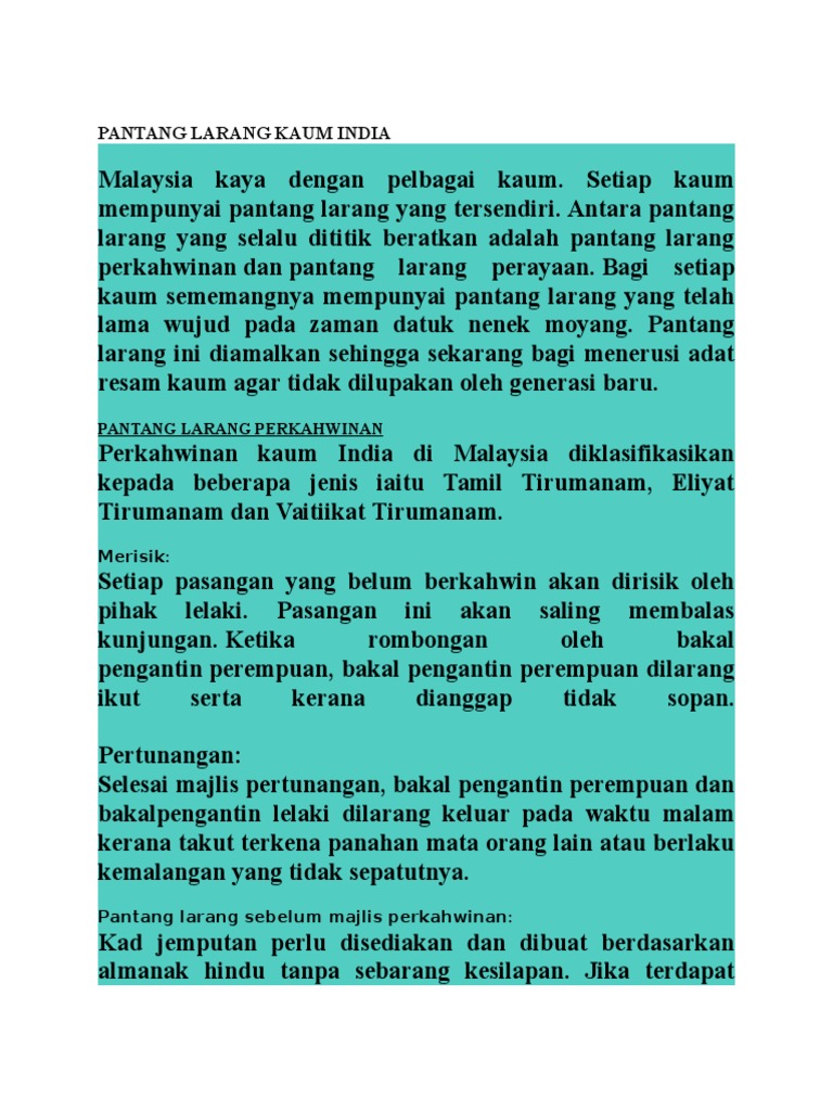 4 1 perkahwinan kaum india masyarakat india merupakan etnik ketiga terbesar di malaysia dan juga salah satu kaum yang telah menyumbang ke arah pembentukan sebuah masyarakat majmuk di negara kita. Bagi setiap kaum sememangnya mempunyai pantang larang yang telah lama wujud pada zaman datuk nenek moyang. Malaysia kaya dengan pelbagai kaum. Adat resam pantang larang kaum india pantang larang perkahwinan untuk mengelakkan keadaan buruk perkahwinan akan dilakukan pada waktu tengah malam atau matahari akan naik di dalam perkahwinan kaum india pokok pisang merupakan simbol untuk menolak bala pokok pisang itu tidak.