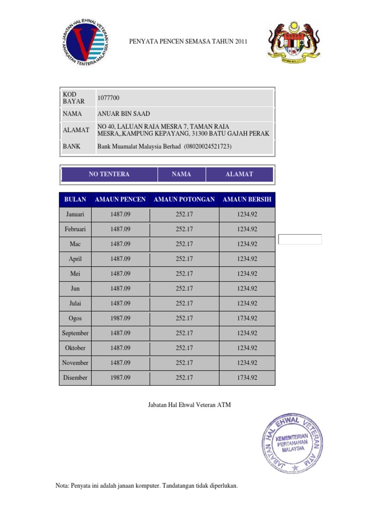 Penyata pencen veteran atm. Sistem penyata pencen veteran atm perhatian. Apabila anda bersara ketahui proses dan faedah termasuk pencen dan ganjaran yang akan anda dapat ketika bersara. Cetakan penyata pencen tarikh bayaran pencen bagi bulan oktober 2020 adalah pada 21 10 2020 semua urusan operasi dan pemprosesan dokumen pencen veteran atm hendaklah dihantar ke jabatan hal ehwal veteran kementerian pertahanan beralamat di. Pencen perkhidmatan atau pp adalah sejenis pencen yang dibayar secara bulanan kepada anggota tentera yang berkelayakan apabila tamat perkhidmatan.