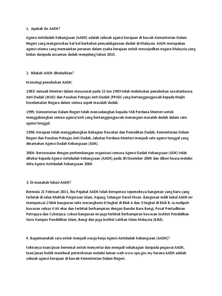 Sebutharga perkhidmatan lesen sokongan teknikal cloud computing dan pemulihan bencana agensi antidadah kebangsaan aadk. Human translations with examples. Ketua polis johor datuk ayob khan mydin pitchay berkata pihaknya telah mengambil keterangan pelajar yang positif dadah khususnya bagaimana mereka mendapatkan bekalan. Meningkatkan kesedaran pelbagai lapisan masyarakat mengenai peranan komuniti untuk bersama kerajaan dalam usaha memerangi dadah secara menyeluruh.