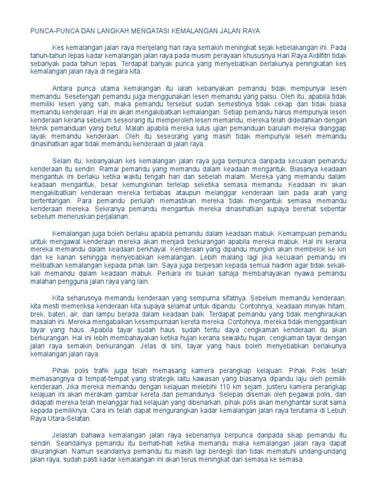Karangan pt3 punca punca kemalangan jalan raya. Walaupun malaysia mempunyai undang undang dan peraturan yang ketat serta mampu memberi kesan terhadap psikologi masyarakat tempatan namun ketidaktegasan dalam pelaksanaan undang undang sudah pasti membuka ruang kepada sesetengah pihak untuk terus melakukan kesalahan di jalan raya. Semoga perkongsian bahan bahan rujukan panduan bahan pembelajaran dan pengajaran contoh contoh karangan sumber rujukan stpm sijil tinggi persekolahan malaysia tingkatan 6 dalam post di blog bumi gemilang berguna dan dapat membantu para pelajar dan. Karangan ulasan bahasa melayu bm pt3 punca kemalangan jalan raya pentaksiran tingkatan 3.