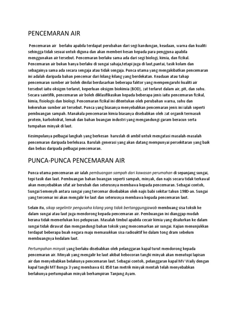 Punca punca pembuangan sisa domestik di kawasan perumahan. Dari masa ke masa jenis sisa domestik ini akan menjadi baja oleh penghuraian mikroorganisma. Punca utama pencemaran air ialah pembuangan sampah dan bahan buangan domestik dari kawasan perumahan di sepanjang sungai tepi tasik dan laut. Semua sisa makanan lebihan sisa taman kotoran dan daging busuk diklasifikasikan sebagai jenis sisa domestik bersifat organik. Pembuangan sisa jualan makanan di premis perniagaan apabila kedai kedai jalanan memakai membuang plastik merata rata plastik serbaguna penduduk 2.