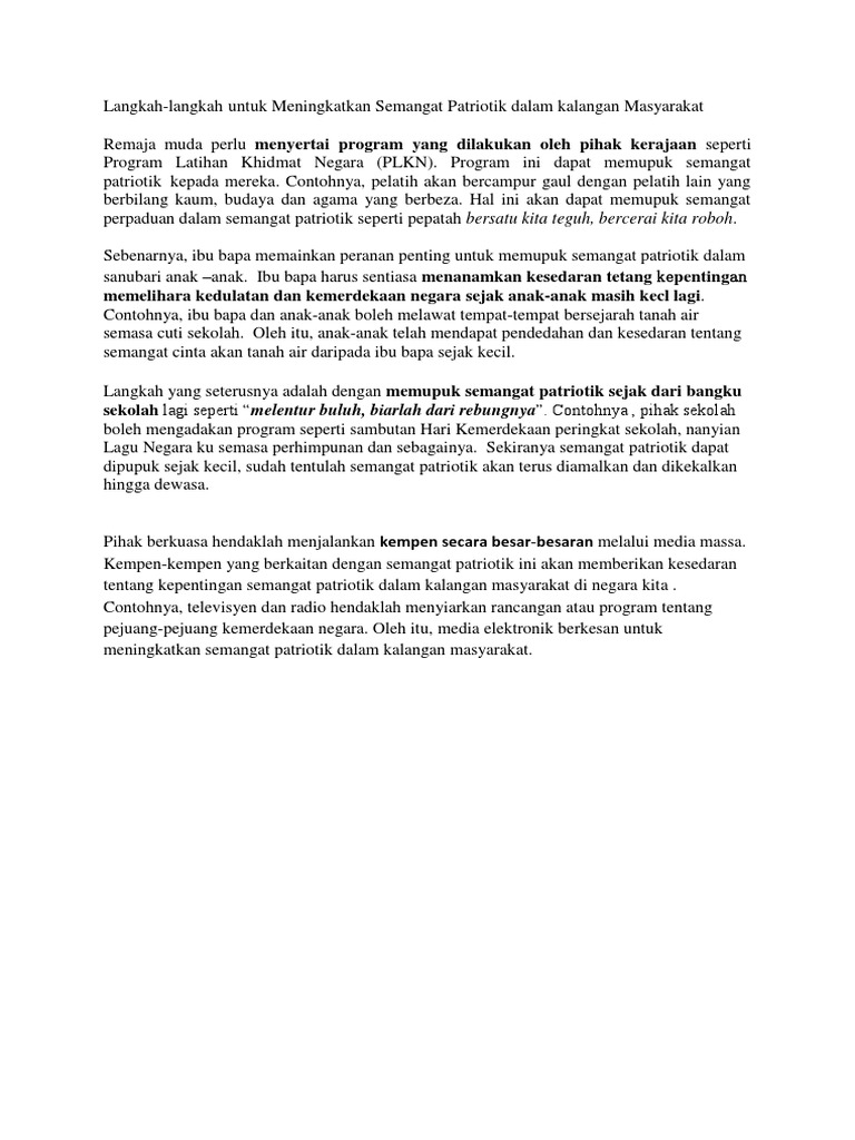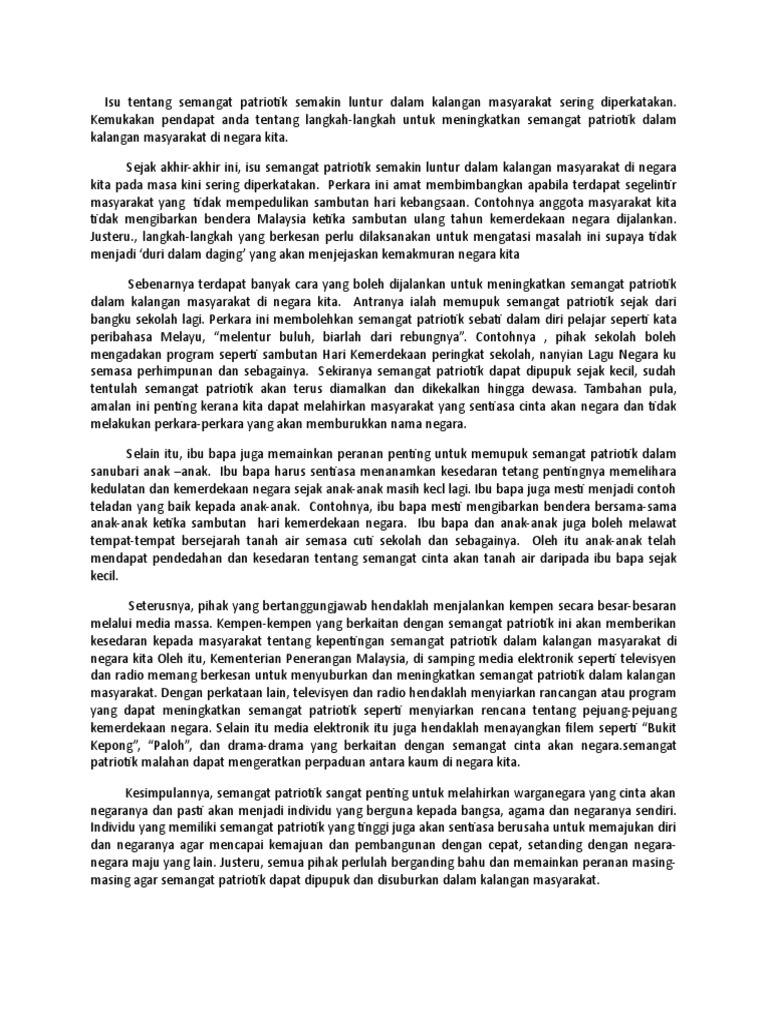 Semangat perpaduan dalam kalangan masyarakat. Gejala ini boleh membawa pelbagai kesan negatif jikalau tidak dibendung lebih awal bincangkan pendapat anda tentang kesan kesan gejala tersebut dan langkah langkah untuk membendungnya. Sekiranya terlerai ikatan silaturahim dan musnah perpaduan dalam masyarakat nescaya pelbagai impak negatif akan menimpa masyarakat khususnya dan negara amnya. Antara kepentingan semangat nasionalisme dalam kalangan masyarakat ialah mewujudkan rakyat mempunyai semangat nasionalisme yang saling bekerjasama dan bertoleransi antara satu sama lain dengan mengamalkan semangat nasionalisme ini semua kaum dapat mengamalkan kebudayaan adat resam agama dan bahasa masing masing yang mempunyai keperibadian budaya dan identiti tersendiri sehingga sekarang. Memang tidak dapat dinafikan bahawa negara pada masa kini sudah berada di peta masyarakat antarabangsa ekoran daripada usaha kerajaan yang berterusan membina negara yang disegani di peringkat dunia.