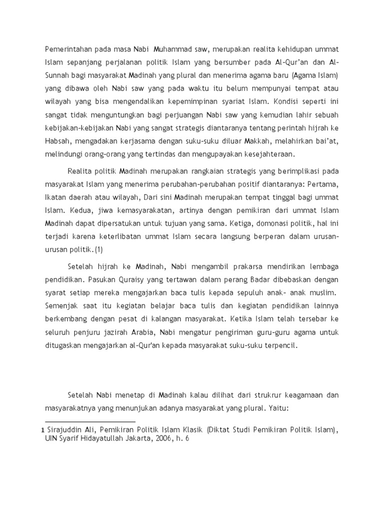 Sebenarnya pemerintahan dan kepemimpinan rasulullah s a w. Telah mendirikan sebuah kerajaan islam di madinah dengan membuat beberapa dasar penting antaranya sebagai ketua kerajaan yang memerintah. Madinah adalah pusat pemerintahan dimana seluruh kebijakan tugas politik pemerintahan berada sepenuhnya di tangan nabi muhammad s a w. Sampai di sini kita dapat memahami bahwa negara madinah yang didirikan nabi muhammad saw.