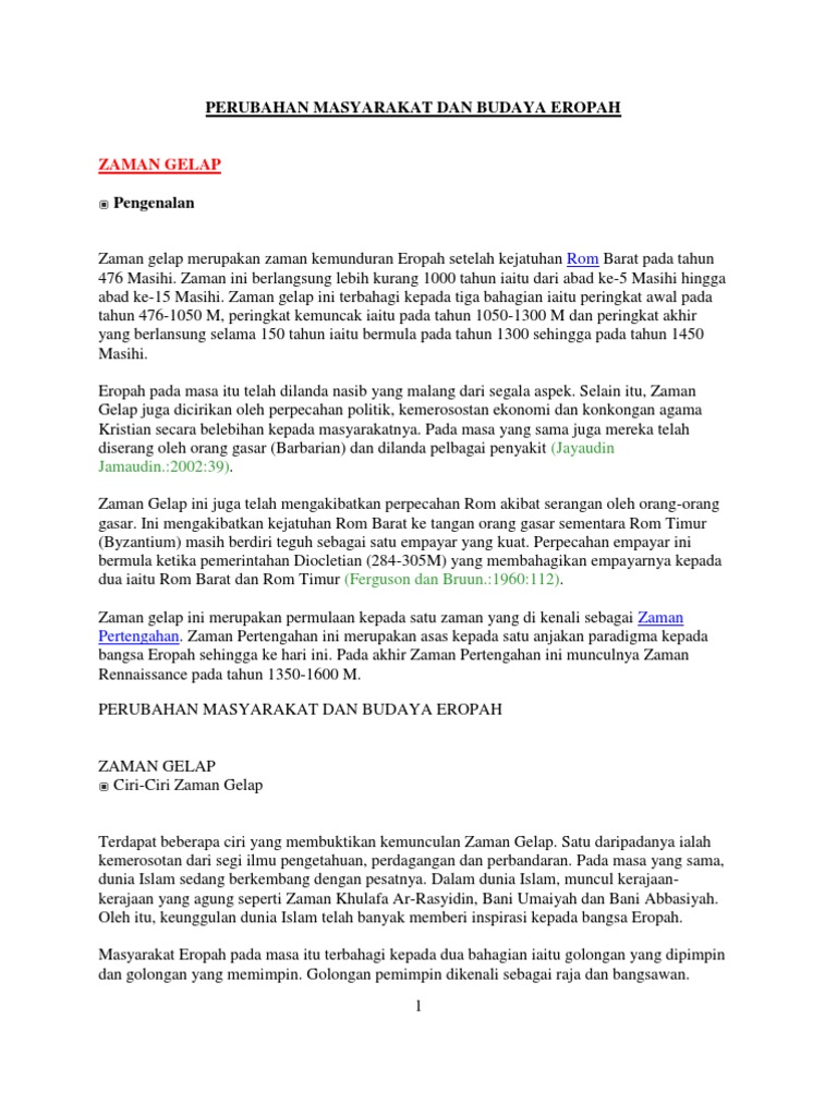 A maksud zaman gelap. Zaman pertengahan menjadi perantaraan antara orang eropah kerana di sini bermulanya kelahiran artisan artisan dan pedagang pedangan. Negara negara eropah moden bermula pada zaman ini. Pada peringkat akhir zaman pertengahan ini telah muncul zaman renaissansce 1350 1600 m pada zaman ini berlakunya kegiatan penjelajahan dan penerokaan mereka kepada perkembangan ilmu.